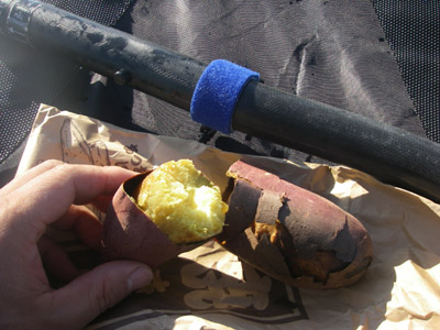 カヤックのうえで焼き芋を食べるときは予めドライバックから飲み物を出しておきましょう(笑)