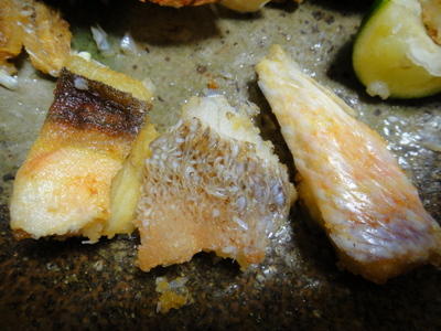 カサゴ→鱗が開いて見た目綺麗だけど、少し鱗が硬い。よく揚げれば良いんだけど、そうすると身が揚がり過ぎのような気がする。よって、次回からは鱗を取る。
