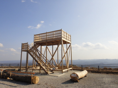 とりあえず九十九谷公園へ。公園隣接の駐車場ではなく道を挟んだ駐車場へ車を停めると、なんか出来たてほやほや感のある展望台が。早速登ってみます。