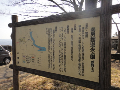 鹿野山:房総丘陵の一角を成す千葉県で3番目に高い山で、上総地方の最高峰である[1]。鹿野山とは、白鳥峰(東峰、379m)・熊野峰(中央峰、376m)・春日峰(西峰、352.4m、1等三角点)の3峰の総称である。熊野峰の直下には神野寺が、春日峰には国土地理院の測地観測所がある。山の南面は、「九十九谷」と呼ばれる景勝地で、侵食によってできた複雑な地形となっている。(wiki調べ)