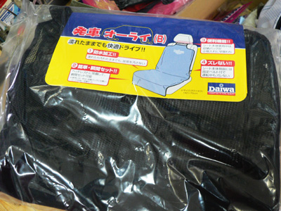 車のシート用の防水カバーです。使用しないときは畳んでヘッドレストにぶら下げて