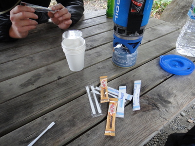 アップダウン禁止。あとは下るだけだなってぬか喜びさせるの禁止。とか、金返せとか、下りはすべり台作れとか、ブツブツいいながらなんとか下山。先ほどの大仏の前の休憩所でコーヒーのんで帰ろうってことで、またまたジェットボイルの登場です。高かったから使いたくて使いたくて(笑)