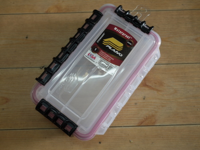 プラノ製の防水ケースです。帰ってきて使ってない道具を洗うの面倒くさくて防水ケースを使ってます。ホームセンターで売ってる奴はすぐに紫外線劣化で割れてしまうので、これに行き着きました。便利ですよ。