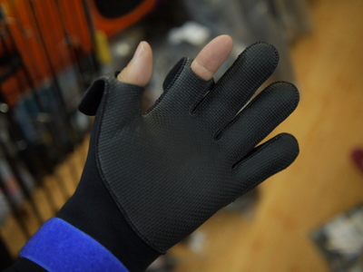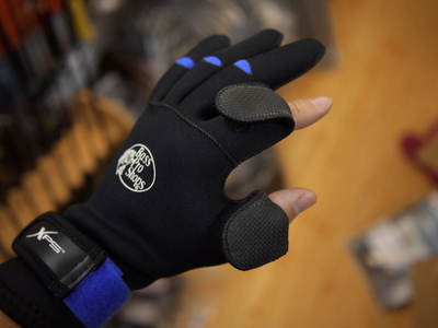 3mmネオプレンと少し厚手ながら、立体裁断でフィット感の良いネオプレングローブです。厚手なので防寒効果は高いですが、素手感はどうしても損なわれるので、防寒効果を重視したい人にオススメです。親指と人差指がめくれるようになっているので、ラインの結び替えなどはやりやすくて便利です。