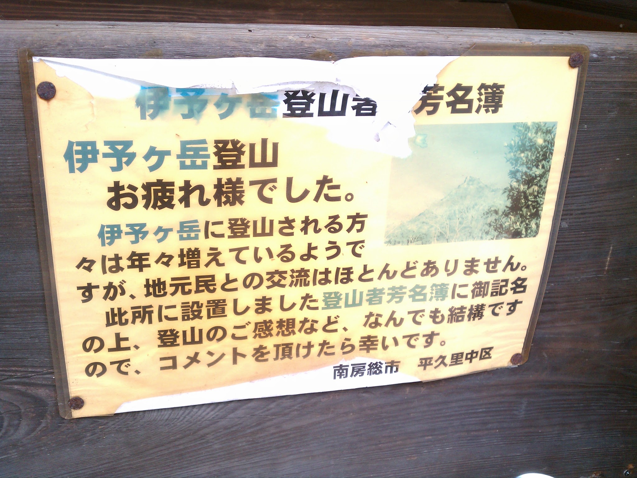 伊予ヶ岳(いよがたけ)は、千葉県南房総市にある山で、標高336.6m。房総丘陵の山の一つである。なだらかな山が多い房総の山の中では珍しい岩峰で、県内で唯一山名に「岳」がつく山である。伊予国の石鎚山に、山容が似ていることから、伊予ヶ岳の名前がついたといわれている。(wikiしらべ)