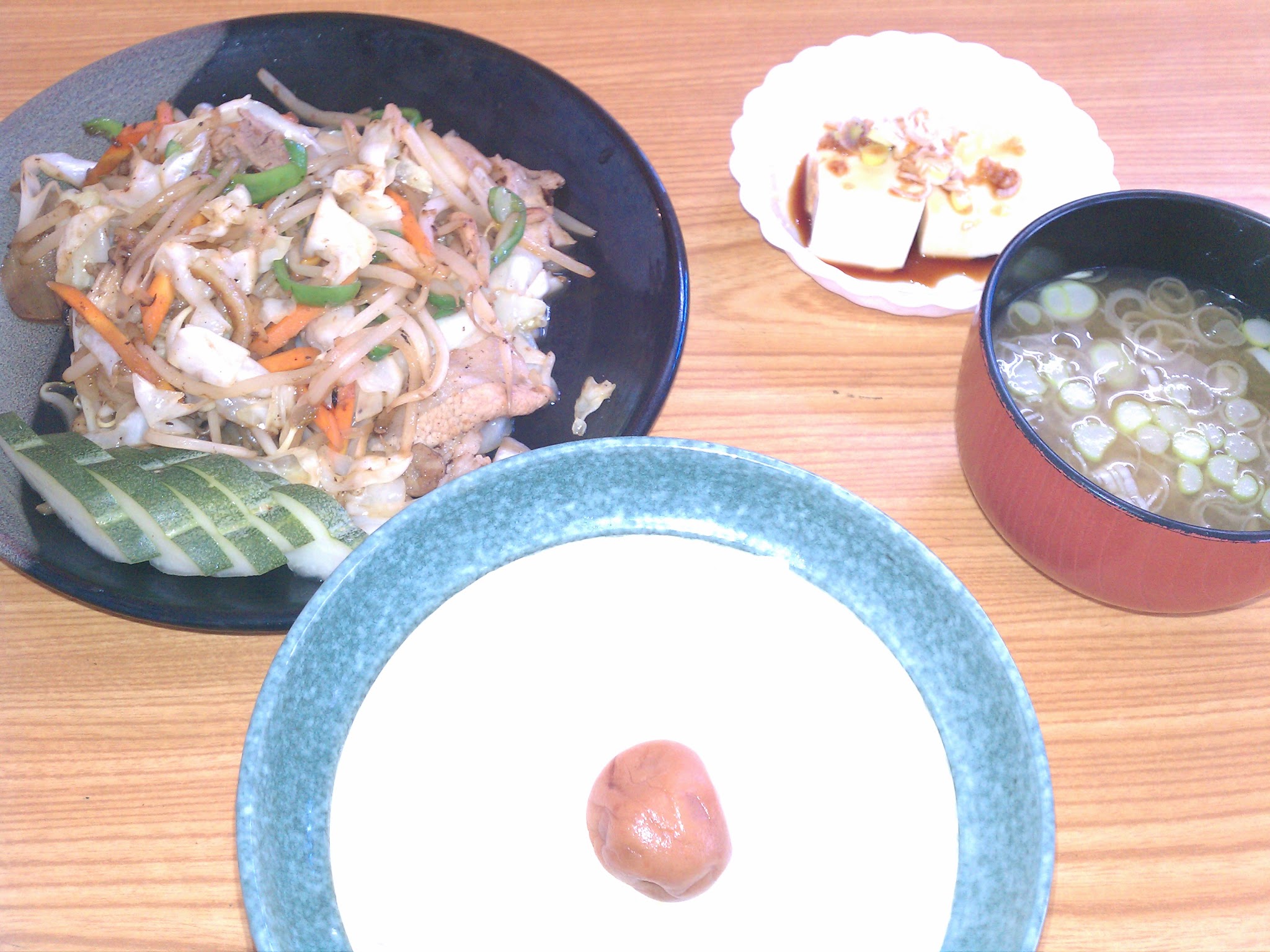 野菜炒めを頂いたんですけど、冷奴に漬物に味噌汁までついてきて美味しかったー。