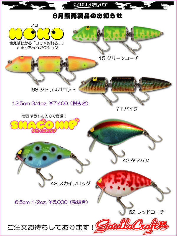 今月発売予定のルアー、Tシャツ、ロッドのご予約受付中です。お気軽にお申し付けください。