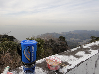 アップダウン禁止。あとは下るだけだなってぬか喜びさせるの禁止。とか、金返せとか、下りはすべり台作れとか、ブツブツいいながらなんとか下山。先ほどの大仏の前の休憩所でコーヒーのんで帰ろうってことで、またまたジェットボイルの登場です。高かったから使いたくて使いたくて(笑)